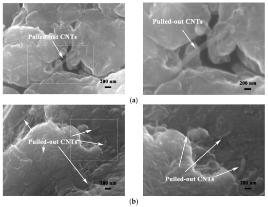 Figure 8 shows the fracture morphology of CNTs/refined-AZ61 composites. CNTs are obviously pulled out at the fracture surface in Figure 8a,b, indicating that CNTs played a bridging role in load transfer [18] and hindered the crack propagation during deformation.
