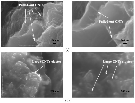 With the increase in CNT content in composites, more and more CNTs could be observed at the fracture, as shown in Figure 8c. When CNT content is 2 vol.%, there are some large CNT clusters at the fracture surface, as shown in Figure 8d. Due to poor internal bonding force at the CNT cluster, it is easy for it to become the source of cracks due to stress concentration during deformation, resulting in cracking and the degradation of strength and fracture strain in composites [9]. This phenomenon corresponds to the compressive properties of composites.