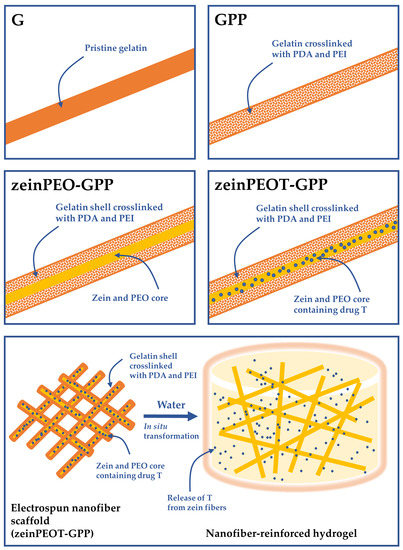 Different types of uniaxial and coaxial samples that were electrospun in the scope of this study (top four images) and concept of the in situ transformation of the nanofiber scaffold into a nanofiber-reinforced hydrogel (bottom image). Key: G, sample containing gelatin; GPP, sample containing gelatin crosslinked by polydopamine and polyethyleneimine; zeinPEO-GPP, sample containing zein and polyethylene oxide in the core and gelatin crosslinked by polydopamine and polyethyleneimine in the shell; zeinPEOT-GPP, sample containing zein, polyethylene oxide and tetracycline hydrochloride in the core and gelatin crosslinked by polydopamine and polyethyleneimine in the shell.