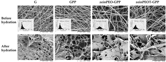 The pore analysis revealed pore sizes of 3.0 µm ± 2.3 µm (G), 9.2 µm ± 4.9 µm (GPP), 36.2 µm ± 6.8 µm (zeinPEO-GPP) and 26.3 µm ± 4.7 µm (zeinPEOT-GPP) for the different samples after 24 h of hydration.
