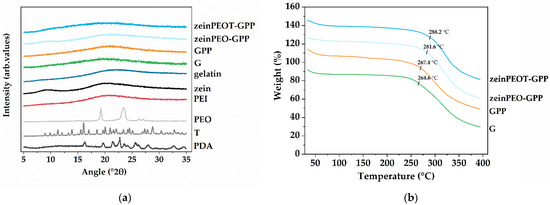 XRD patterns of all analyzed samples show a halo characteristic of amorphous materials, while some of the raw materials show characteristic peaks as they are crystalline (e.g., T) or semi-crystalline (e.g., PEO) (Figure 4a). The TGA results show two degradation steps, where the first, between 50 °C and 100 °C, can be attributed to water loss (Figure 4b). The onset of sample degradation was determined to be 273.0 °C ± 2.7 °C (G), 266.6 °C ± 0.9 °C (GPP), 282.9 °C ± 2.1 °C (zeinPEO-GPP) and 286.5 °C ± 1.5 °C (zeinPEOT-GPP), with the onset of degradation of the core-shell fiber being slightly higher than those of the uniaxial samples (p < 0.001) (Table A1).