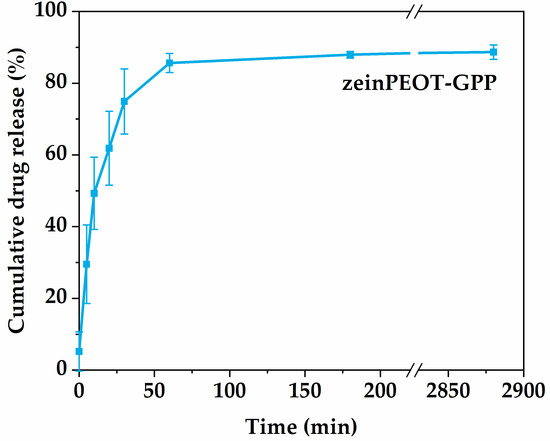 The encapsulation efficiency of T within zeinPEOT-GPP scaffolds reached 72.2 ± 6.2%. A burst release of T was observed within an hour from zeinPEOT-GPP scaffolds (Figure 5). The release kinetics of T followed the Korsmeyer–Peppas model (Table A2) [53].