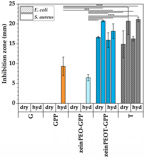 Results for the antimicrobial studies. Bacterial inhibition of E. coli and S. aureus by dry and pre-hydrated (hyd) nanofiber scaffolds. The data are presented as means with standard deviations of p < 0.0002 (***) and p < 0.0001 (****). Key: G, fiber sample containing gelatin; GPP, fiber sample containing gelatin crosslinked by polydopamine and polyethyleneimine; zeinPEO-GPP, fiber sample containing zein and polyethylene oxide in the core and gelatin crosslinked by polydopamine and polyethyleneimine in the shell; zeinPEOT-GPP, fiber sample containing zein, polyethylene oxide and tetracycline hydrochloride in the core and gelatin crosslinked by polydopamine and polyethyleneimine; T, tetracycline hydrochloride-containing control sample.