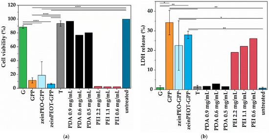 All samples containing PEI, including the PEI control samples in two concentrations, demonstrated high cytotoxicity towards fibroblasts according to both LDH and MTT assays (Figure 7). In contrast, sample G as well as the T, PDA and untreated control samples showed good cell viability above 80% (Figure 7a) and a low LDH release (Figure 7b).