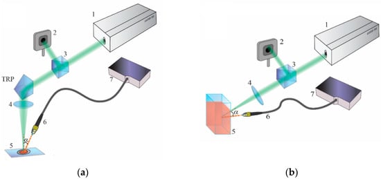 The scheme of the experimental setup. (a) Examination of samples #1 (layers); (b) examination of samples #2 (suspensions). 1—laser; 2—energy meter; 3—beam-splitter; 4—convex lens; 5—sample, 6—fiber-optic patch cord, 7—spectrometer; TRP—totally reflecting prism.