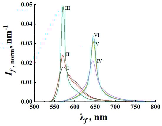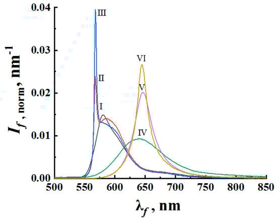 Evolution of the normalized fluorescence spectra with an increase in the pump intensity. I–III—R6G-doped samples #1; VI–VI—DCM-doped samples #1. 1.0 × 106 W/cm2 (I); 1.3 × 107 W/cm2 (II); 3.9 × 107 W/cm2 (III); 2.2 × 107 W/cm2 (IV); 1.0 × 108 W/cm2 (V); 1.4 × 108 W/cm2 (VI).