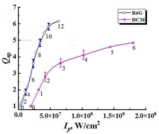 values against pump intensity for the R6G- and DCM-doped samples #1. Selectively shown error bars correspond to a confidence level of 0.9.