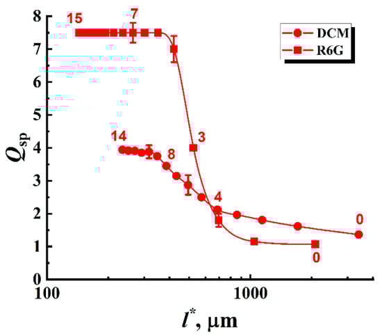 As follows from Figure 10a–c, the estimated values of are between 20 µm and 30 µm ( 25 µm; 28 µm; 25 µm). On the other hand, the previously obtained estimated values of for 532 nm-pumped dense random media [48] are between 70 nm and 100 nm; the corresponding values of are between 0.002 and 0.004. Accordingly, the extreme value of in the case of green laser pumping is expected to be between 17 µm and 50 µm. This estimate satisfactorily agrees with the above-presented values for the examined systems under the condition of over-pumping. At the same time, the applied pumping mode is not sufficient to achieve the extreme maximal values of (Figure 6, curve 2) and (Figure 8b) for the DCM-based suspension (Figure 10d). The corresponding saturated value of 65 µm is approximately 2.5 times larger than for other samples.