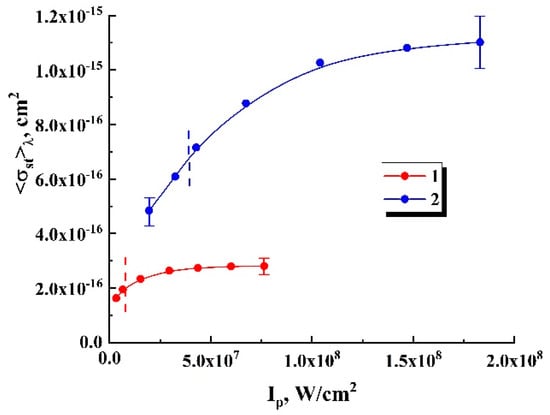 The wavelength-averaged cross sections of the stimulated emission of fluorophore molecules against the pump intensity. 1—R6G molecules, 2—DCM molecules. Selectively shown error bars correspond to a confidence level of 0.9. Vertical dashed lines correspond to the random lasing thresholds for the samples #1.