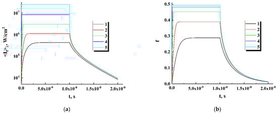 Saturation of (a) and (b) during the action of a single laser pulse (modeling results). Pump intensity: 1 × 106 W/cm2 (1); 3 × 106 W/cm2 (2); 9 × 106 W/cm2 (3); 2.7 × 107 W/cm2 (4); 8.1 × 107 W/cm2 (5).