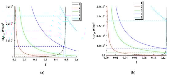Graphical interpretation of the solution of System (11). Curve (1) corresponds to the first equation; curves (2–5) correspond to the second equation at various values of the pump intensity. Horizontal and vertical dashed lines mark unique solutions of (11) for the given pump intensities. (a) R6G-filled local emitter, 1 × 106 W/cm2 (2), 5 × 106 W/cm2 (3), 2 × 107 W/cm2 (4), 8 × 107 W/cm2 (5); (b) DCM-filled local emitter, 1 × 107 W/cm2 (2), 5 × 107 W/cm2 (3), 1 × 108 W/cm2 (4), and 5 × 108 W/cm2 (5).