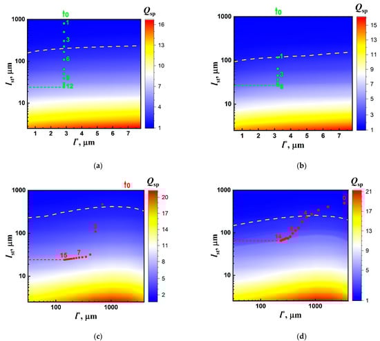 Figure 10 shows a set of color maps displaying model distributions of the enhancement factor in the domain together with the empirical values of for the examined samples #1, 2. The model values of for color mapping were obtained from a set of recovered spectra generated using the above-described Monte Carlo modeling and recovery procedure. The and values for the modeled R6G- and DCM-doped random layers with isotropic scattering varied in wide intervals to cover the experimentally observed ranges of for the examined densely packed layers (#1) and suspensions (#2) of anatase nanoparticles. Accordingly, for the first case, detailed color maps with high resolution and a narrow range along the -axis are used (Figure 10a,b). The states for the pumped samples #2 are presented on the “panoramic” color maps with significantly wider displayed intervals in the domain (Figure 10c,d).