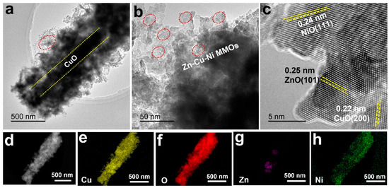 TEM (a,b), HRTEM (c), dark-field TEM (d), and elemental mapping (e–h) images of the ZnCuNiOx MMOs.