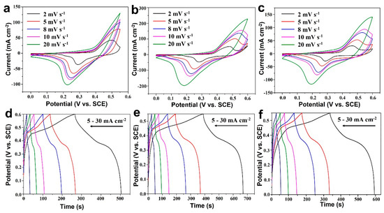 The GCD curves at various current densities (5, 8, 10, 15, 20, and 30 mA cm−2) are illustrated in Figure 4d–f, where the charge–discharge platforms can be clearly observed for all three test cases. Similar to the CV results, the GCD time of e (with light but without cooling water) is much longer than that of d (without light or cooling water) and f (with light and cooling water) at the respective current densities. This result has again confirmed that the introduction of light into photoelectrodes is favorable for improving the electrochemical charge storage.