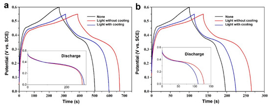 When the current density was increased to 10 mA cm−2, the entire GCD time delivered was reduced for all three testing cases (Figure 5b). Similarly, the testing case of light illumination without cooling water shows the best performance among all the testing cases, which additionally confirms that photoenhancement indeed works for different current densities. Furthermore, it should also be noted that a larger potential window usually leads to a longer GCD time [38]. In our experiment, the testing case without light or cooling water was performed using a potential window of 0–0.6 V, while the latter two cases were conducted with a narrowed potential window of 0–0.55 V as a conservative comparison, which further suggests that the utilization of light energy is an efficient strategy to promote electrochemical charge storage.