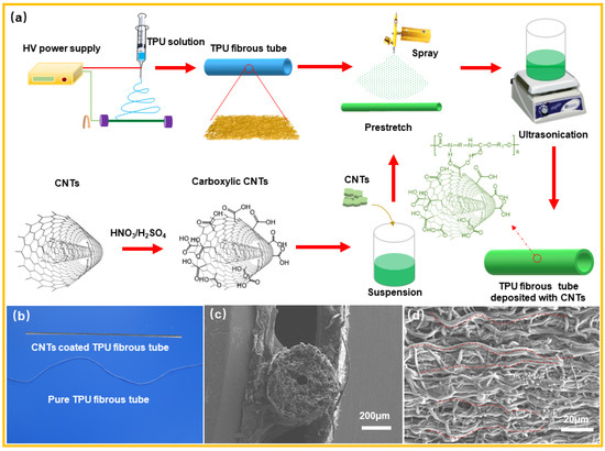 To fabricate the TPU fibrous tubes, an 18 wt% TPU spinning solution containing a mixed solvent of THF and DMF at a ratio of 3:1 was firstly prepared, and then electrospinning was carried out by using a rotating iron wire (with a diameter of 1 mm) as the fiber collector. During the electrospinning, the TPU solution was extruded from a 22 G nozzle through a micro-extruding pump under specific conditions: an extrusion rate of 10 mm/h, a rotational speed of 250 rev/min, a distance of 15 cm between the needle and the receiver, a high voltage of 15 kV, and a spinning time of 5 min. When the spinning was completed, the TPU fibrous tube was removed from the wire, stretched to a ratio of 1.2 (20% strain). Afterward, the pre-prepared CNTs suspensions with different concentrations were sprayed onto the stretched fibrous tubes. Next, the fibrous tubes containing CNTs were ultrasonicated in the CNTs suspension with the same concentration as that for spraying for 1 h. The combination of spraying and ultrasonic assisted coating was intended to deposit more CNTs and prevent the shedding of CNTs. Figure 1a illustrates the procedure for fabricating the TPU/CNTs fibrous tubes. Using this process, CNTs coated TPU fibrous tubes with oriented and wavy structured fibers were obtained, as shown in Figure 1b–d.