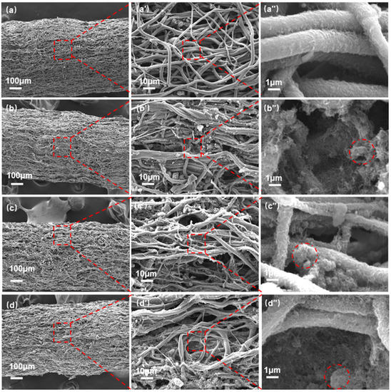 SEM images of the TPU fibrous tubes prepared with CNTs concentrations of (a–a″) 0.5 wt%, (b–b″) 1.0 wt%, (c–c″) 1.5 wt%, and (d–d″) 2.0 wt%, (the areas enclosed by the red dash lines represent CNT agglomerates).
