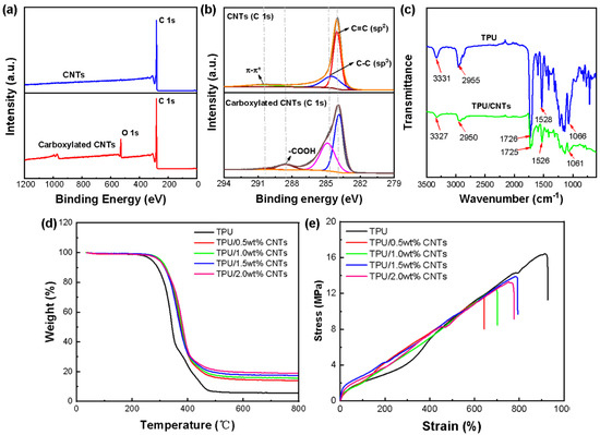 (a) XPS wide scan spectra of the CNTs and carboxylated CNTs; (b) C 1s core–level spectra of the CNTs and carboxylated CNTs; (c) FTIR spectra of the CNTs and carboxylated CNTs; (d) TG curves and (e) typical stress–strain curves of TPU/0.5 wt% CNTs, TPU/1.0 wt% CNTs, TPU/1.5 wt% CNTs and TPU/2.0 wt% CNTs.