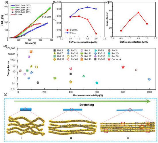 (a) Plots of relative electrical resistance change versus strain for TPU/0.5 wt% CNTs, TPU/1.0 wt% CNTs, TPU/1.5 wt% CNTs, TPU/2.0 wt% CNTs and the relative resistance–strain fitting curve of TPU/1.5 wt% CNTs; (b) the r2 of TPU/CNTs tube prepared with various CNTs concentrations; (c) the relation between GF of TPU/CNTs tube and CNTs concentration; (d) comparison of the maximum GF and the maximum sensing strain reported in the literature and the research described in this text; (e) schematic illustration of the changes in TPU/CNTs fibers during stretching.