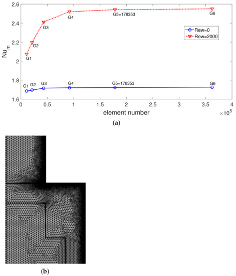 Grid independence of the solution is assured, and test results are given in Figure 2a. The average Nu for different grid sizes at Rew = 0 and Rew = 2000 are shown in the plot. A grid system G5 with 178,353 number of elements is used. Figure 2b shows the grid distribution near the step, while refinement is performed at the interfaces and towards the walls.