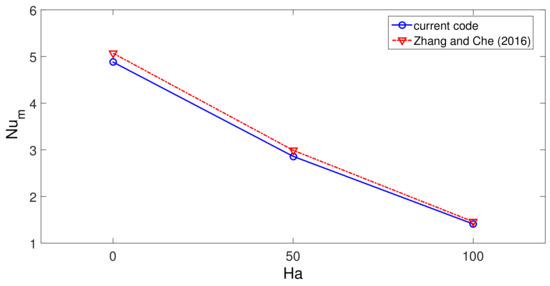Code validation 1: Average Nu comparisons of convection in a differentially heated cavity for different Ha at Grashof number of .