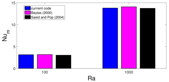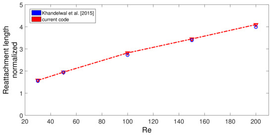 The code is validated by various sources available in the literature. In the first validation study, the effects of using MaF on convective HT in a differentially heated cavity is considered, and results in [93] were utilized. Comparisons of average Nu for three different MaF strengths at Grashof number of are shown in Figure 3. The highest difference below 5% is achieved between the results. In the second validation study, convection in a differentially heated porous enclosure is considered. Average Nu at two different Rayleigh numbers are shown in Figure 4 with the available results in two different sources [94,95]. As the last validation study, flow separation in a bifurcating T-channel is analyzed under laminar flow conditions. Figure 5 shows the comparison results of normalized reattachment length versus Re available in Ref. [96] for a Newtonian fluid. These results show that the present solver is capable of simulating the effects of MaF and porous media impacts on convective HT, while predictions for flow separation effects can also be performed.