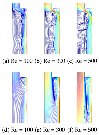 F-P variations with varying Re at two different permeabilities of the PL ((a–c), Da = 10), ((d–f), Da = 10) (Rew = 1000, Ha = 7.5, ax = 0.25 ap, N = 4).