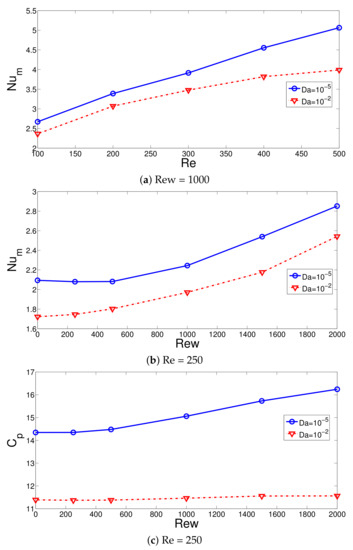 The average Nu rises with higher values of Re and Rew considering the lowest and highest PL permeability as shown in Figure 8a,b with (Ha = 7.5, ax = 0.25 ap, N = 4). The Nu values are higher when PL with lower permeability is considered. This is attributed to the more deflection of the main fluid stream toward the hot wall for the object with the lower permeability. At Re = 100, the Nu values are 13% higher when cases with the lowest and highest Da are compared, while this amount is further increased to 25% at Re = 500. The additional momentum added to the main stream and suppression of the recirculation with higher rotational speeds resulted in higher average HT values. The rise in the average Nu becomes 47.6% and 42.5% when the cases at Rew = 0 and Rew = 2000 are compared for the PL with the highest and lowest permeability. The vortex suppression with rotation is significant for the case when PL with lower permeability is considered. The pressure coefficient also rises with higher rotational speeds of the surface when PL with lower permeability is considered (Figure 8c). In this case, the value of Cp rises by about 13%, while less than 2% variation is seen when configuration at Da = is considered.