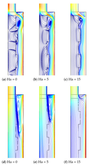 The PL is a wavy one with rectangular type corrugation. The corrugation height is denoted by ax, while the number of corrugation waves is denoted by N. Corrugation wave amplitude effects on the flow pattern variations are shown in Figure 12 for two permeabilities of the PL at (Re = 250, Rew = 1000, Ha = 7.5, N = 4). The impact of corrugation height is effective for the case with lower permeability, while vortices are formed in the small cavities of the corrugation at the interface between the PL and fluid.