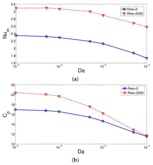 Comparisons of average Nu and pressure coefficients for different Da at stationary and rotating wall cases are shown in Figure 11 for fixed values of (Re = 250, Ha = 7.5, ax = 0.25 ap, N = 4). Lower permeability configurations with rotating surfaces lead to higher HT and pressure coefficients. The impacts of rotation of the variation of Cp reduces with permeability. The impacts of rotation on the reduction of average Nu with higher permeability becomes less. The amount of reduction in the average Nu between the lowest and highest Da cases becomes 14% and 52.7% at Rew = 2000 and Rew = 0.