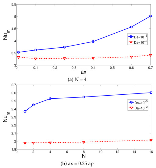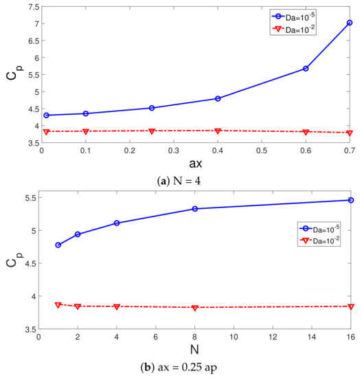 The impacts of the corrugation geometric parameters on the average Nu and pressure coefficients are effective for the case with the lower permeability of the PL as shown in Figure 13 and Figure 14 with (Re = 250, Rew = 1000, Ha = 7.5). A higher value of the corrugation height results in higher HT and pressure coefficients. This is due to the reduction in the gap between the rotating hot surface and corrugated PL interface where at lower values of Da, local fluid velocity rises, and thermal transport enhances. The PL acts as an obstacle that redirects the main fluid stream toward the hot wall for lower permeability. The HT and pressure coefficients rise by about 42% and 62.8% when increasing the wave amplitude from ax = 0.01 ap to ax = 0.7 ap. However, the amount of rise becomes only 9.7% and 14.46% when the wave number is increased from N = 1 to N = 16. It is seen that the hydro thermal performance can be controlled in a good way by varying the permeability and wavy geometrical parameters of the PL. The permeability of the PL and corrugation amplitude have the highest impacts of the HT and pressure coefficient variations.