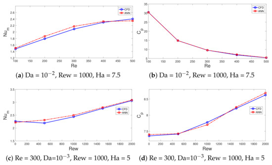 In total, a 2401 data set from CFD simulations is used, while data is divided randomly into training, validation and testing data sets; of the data is used for training, while the remaining of each data set is used for validation and testing. One hidden layer is used with the hyperbolic tansig as the activation function (). The hidden layer has 25 neurons, while Levenberg–Marquardt with backpropogation is considered as the learning algorithm of NN [100,101]. An initial value of 10 neurons in the hidden layer is considered, and performance of the NN is explored by using different numbers of neurons, while NN structure with 25 neurons gives the best performance. Table 2 shows the neural model properties. The performance of NN is shown in Figure 16a. During the initial stage of training, the MSE value is high, while after the iteration proceeds, its value is further reduced and best performance is achieved at epoch 372. Figure 16b presents the regression plot for the validation data set. The correlation coefficient is high, while the scattering of points is minimum. Table 3 presents the performance of the neural network model for different data sets. The variations of the average Nu and pressure coefficients with change in the parameters of interest (Re, Rew, Ha and Da) estimated by the NN approach are given in Figure 17 and Figure 18. The trends in the curves of average Nu and Cp are very well captured with the NN procedure. The model has a mathematical form in terms of input–output relations (four input–two out system) via network weights and bias terms which allow fast estimation results for the parameters of interest within the range.