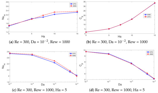 Comparisons of average Nu and pressure coefficient variation with MaF strength (a,b) and permeability of PL (c,d) obtained with CFD and NNs.