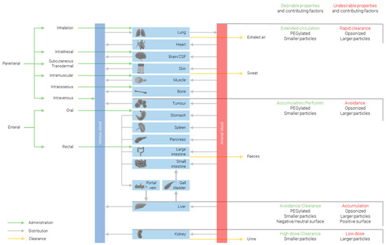 The biodistribution of nanoparticles is heavily impacted by not only the particle size, but also the shape and surface chemistry; therefore, it is important to bear in mind that the trends observed when changing any one of these parameters can be enhanced or countered by changing one of the others. That said, all else being equal, there are significant correlations between biodistribution and size. Figure 1 summarizes some of the ways in which biodistribution is affected by the particles’ properties.