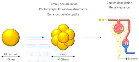 One approach which has been gaining popularity in the past few years is referred to as an ultrasmall-in-nano [30] construct: ‘ultrasmall’ represents the sub-5 nm gold cores, and ‘nano’ represents the 100–500 nm clusters of said AuNPs. While gold itself is inert and biocompatible, problems arise when considering persistence of the gold in the body [30]. The body’s main mechanism for excretion of compounds from circulation, specifically, via the renal pathway, is not efficient at removing particles larger than 5 nm in diameter [100]. This is mainly due to the functional pore size of the glomerular capillary wall of 4.5–5 nm [101] and larger particles will instead rely on elimination via the hepatobiliary pathway. Consequently, particles below this threshold are desirable to avoid the potential retention of gold in the body. However, several desirable properties result from particles only in the 100–500 nm range. These properties include increased circulation times [102], superior accumulation in tumor tissue due to the enhanced permeability and retention effect [103], and specifically in the case of AuNPs strong absorbance in the phototherapeutic window [104]. A work around for these diametrically opposed concepts is to have a system which can be converted from the latter to the former after its function has been served, i.e., from larger (100–500 nm) nanoparticles to ultrasmall (sub-5 nm) particles.