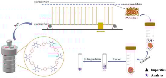 - Chen, A.; Guo, H.; Luan, J.; Li, Y.; He, X.; Chen, L.; Zhang, Y. The electrospun polyacrylonitrile/covalent organic framework nanofibers for efficient enrichment of trace sulfonamides residues in food samples. J. Chromatogr. A 2022, 1668, 462917. [Google Scholar] [CrossRef]