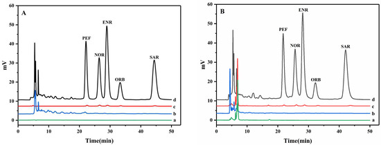- Ye, Z.; Huang, Y.; Luo, Q.; Wang, L.; Huang, X. Preparation of highly fluorinated and boron-rich adsorbent for magnetic solid-phase extraction of fluoroquinolones in water and milk samples. J. Chromatogr. A 2019, 1601, 86–94. [Google Scholar] [CrossRef] [PubMed]