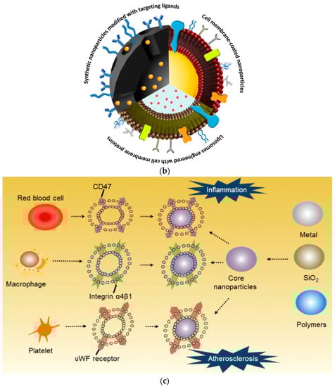 Biomimetic NPs take advantage of both cell membranes and synthetic NPs and are distinguished by three main features: prolonged circulation in the bloodstream, specific binding, and reduced toxicity []. BNMs intended for the targeted therapy of atherosclerosis and inflammatory diseases can be coated with cell membranes derived from various types of cells, such as erythrocytes, macrophages, and platelets. The methods for obtaining cell-membrane-coated NPs can be summarized as a three-step process. At the first stage, the cell membrane is isolated from the original cells (cells can be lysed using various methods, after which centrifugation is used to separate fragments of the cell membrane). Then, the prepared cell wall fragments are repeatedly pressed through a polycarbonate membrane with a pore diameter of ~200–400 nm to obtain microcapsules from the cell membrane, and an NP core with a dissolved drug is also prepared. In the last step, NPs are encapsulated into microcapsules made of the cell membrane (see Figure 1c) [].