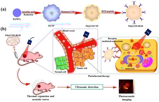 Chitosan-oligosaccharide-coated biocompatible palladium nanoparticles (Pd@COS NPs) for photo-based imaging and therapy. (a) A scheme showing the preparation of Pd NPs, further surface coating with thiolated chitosan oligosaccharide (Pd@COS NPs), and finally, functionalization using an RGD peptide (Pd@COS-RGD). (b) A systematic illustration showing the photothermal ablation and photoacoustic imaging of tumor tissue using Pd@COS-RGD. (Reprinted from [], license CC BY 4.0.)