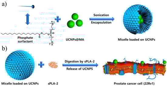 Imaging methods using upconversion nanoparticles (UCNPs) have been proposed as prospective diagnosis tools due to their ability to absorb near-infrared radiation and transform it into visible light through an upconversion process of multiple-photon absorption. Sharipov et al. [] developed novel UCNP-loaded phosphate micelles that could be cleaved by the secreted phospholipase A2 (sPLA-2) enzyme, allowing the release and delivery of UCNPs directly to prostate cancer cells. The ability to release UCNPs in a precise location provided several advantages, including the efficient delivery of UCNPs in low concentrations, an increase in dispersion, and a remarkably high selectivity to prostate cancer cells. Correspondingly, these benefits could reduce biological side effects that other delivery systems have faced. Nanoparticles were prepared with a hydrothermal method, and a delivery system was developed in the form of phosphate micelles synthesized from biocompatible materials (see Figure 4).