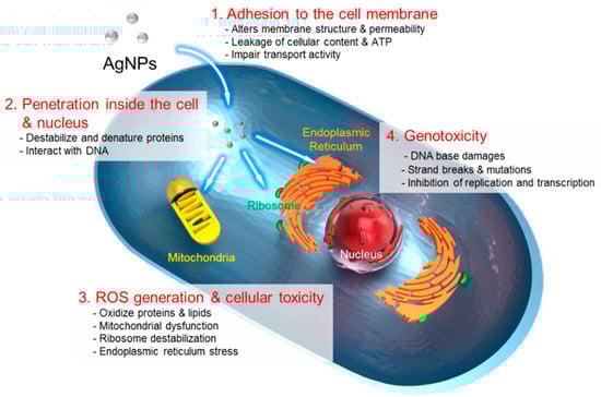 The four main routes of the cytotoxic mechanism of AgNPs. 1: AgNPs adhere to the surface of a cell, damaging its membrane and altering the transport activity; 2: AgNPs and Ag ions penetrate inside the cell and interact with numerous cellular organelles and biomolecules, which can affect corresponding cellular functions; 3: AgNPs and Ag ions participate in the generation of reactive oxygen species (ROS) inside the cell, leading to cell damage; and 4: AgNPs and Ag ions induce the genotoxicity. (Reprinted from [], license CC BY 4.0.)