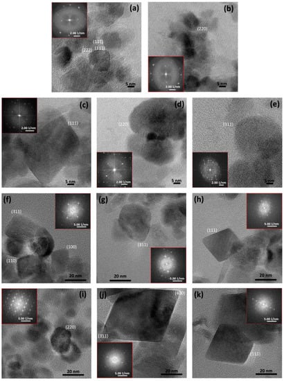HRTEM images of different NPs: (a,b) inorganic magnetite NPs, (c–e) MamC magnetite NPs, (f–h) Mms6 magnetite NPs, and (i–k) Mms6-MamC-mediated NPs. Selected areas of electron diffraction are shown for each sample. (Reprinted from [], license CC BY 4.0.)