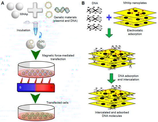 Magnetofection for gene delivery: (A) schematic representation of the process and (B) schematic illustration of DNA loading into lamellar magnetic hydroxyapatite (MHAp) nanoparticles for nucleic acid delivery. (Reprinted from [], license CC BY 3.0.)