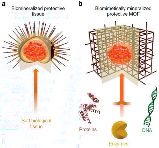 Schematic illustration of biomimetically mineralized metal–organic framework (MOF). (a) Schematic of a sea urchin, a hard, porous, protective shell that is biomineralized by soft biological tissue. (b) Schematic of an MOF biocomposite showing a biomacromolecule (for example, protein, enzyme, or DNA) encapsulated within a porous, crystalline shell. (Reprinted from [], license CC BY 4.0.)