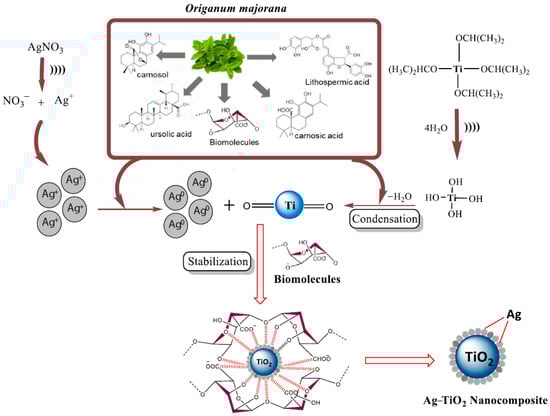 Plausible mechanism for the formation of Ag–TiO2 NCs using Origanum majorana leaf extract. (Reprinted from [], license CC BY 4.0).