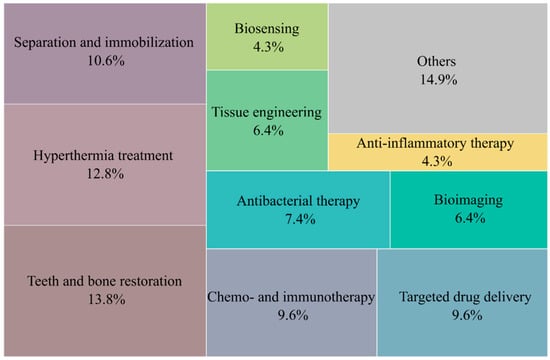 The scientific literature reviewed was summarized based on the application areas of BNMs of the three considered main groups. The distribution of the applications of BNMs indicated in Table 1, Table 2 and Table 3 is shown in Figure 14. The diagram shows that biomedical applications of such materials are currently predominant.