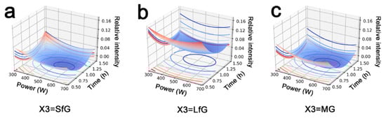 Effect of the exfoliation of graphene (Y) to ultrasonication power (X1) and time (X2) when the graphite is (a) small flaky graphite (X3 = SfG), (b) large flaky graphite (X3 = LfG), and (c) microcrystalline graphite (X3 = MG).