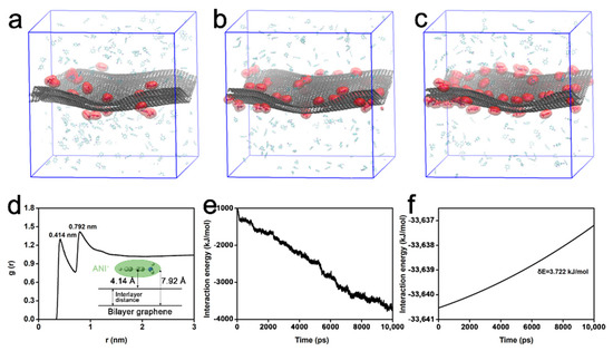 The above experimental results indicate that ultrasonication significantly influences the exfoliation of graphite during in situ intercalation polymerization. Although ultrasonication is widely used for promoting the intercalation of monomers [21,22,23,39], its improving mechanism is still unclear. The dynamic behaviors of ANI+ intercalating into graphite interlayer are fuzzy. To reveal the dynamic process of the intercalation stage, MD simulations were applied together with DFT-based quantum chemical simulations.