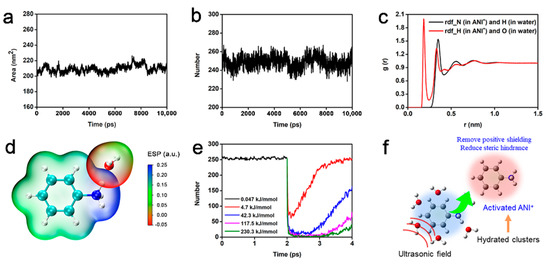 Interactions between ANI+ and H2O in solution. (a) Solvent-accessible surface area of ANI+ in solution; (b) number of hydrogen bonds formed between ANI+ and H2O; (c) radial distribution function between ANI+ and H2O; (d) RESP mapped van der Waals surface of ANI+ and H2O; (e) number of hydrogen bonds between ANI+ and H2O influenced by simulated ultrasonication; (f) schematics of the activated ANI+.