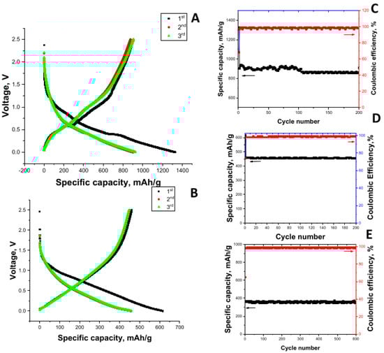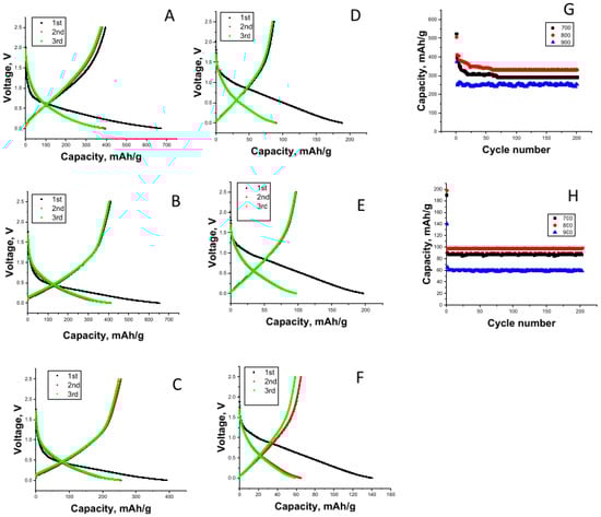 The first Li-ion cell discharge–charge curves for the CNFs carbonized at 700 °C, 800 °C, and 900 °C are shown in Figure 3A–C, respectively. The initial discharge capacities were 671, 652, and 392 mAh/g for the CNFs carbonized at 700 °C, 800 °C, and 900 °C, respectively. The charge capacities of the CNFs carbonized at 700 °C, 800 °C, and 900 °C were 396, 411, and 255 mAh/g, respectively. The initial irreversible capacity can be ascribed to the decomposition of the electrolyte components forming an solid electrolyte interphase (SEI) layer on the electrode surface [33].